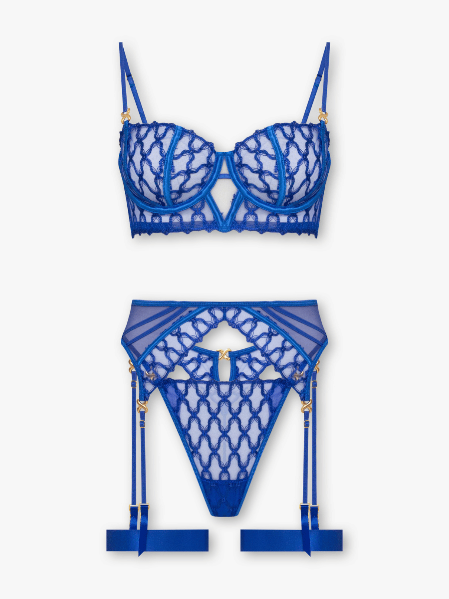 Meet Ceryn, your new power set. Electric blue embroidery and sheer mesh collide for a look that’s bold, unapologetic, and dangerously seductive. Designed to shape, tease, and command attention.