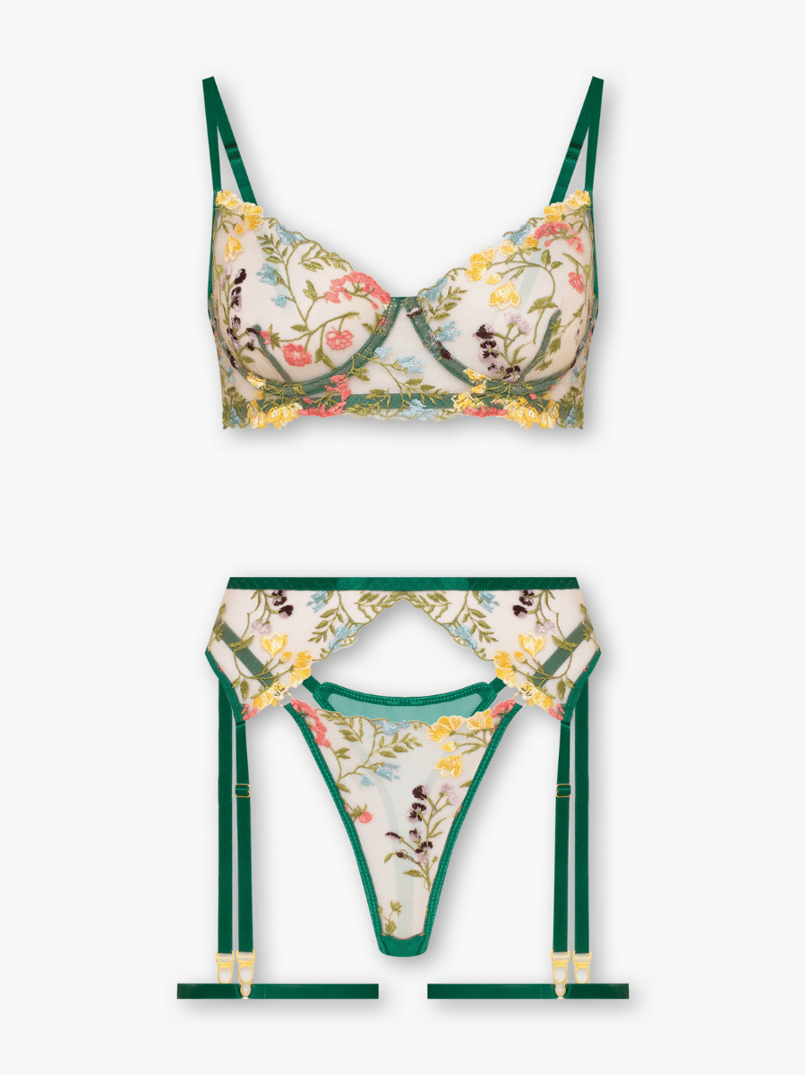 Meet our stunning Heather lingerie set. Heather features delicate floral embroidery overlaid on sheer mesh panelling for a super chic and sexy look. You will surely make a statement with this eye-catching set.